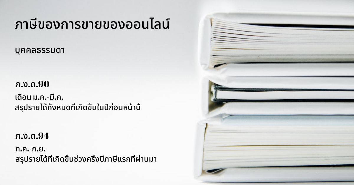 ผู้ค้าออนไลน์ทั่วไปต้องเสียภาษีเช่นเดียวกับมนุษย์เงินเดือนทั่วไป โดยยื่นแบบฟอร์ม ภ.ง.ด.90 และ ภ.ง.ด.94 ซึ่งจะมี 2 ช่วง ได้แก่